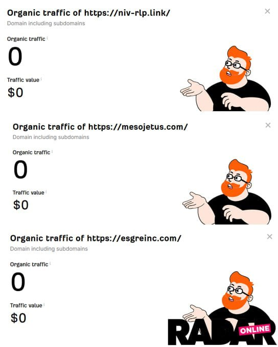 Проверка трафика показывает отсутствие органических посещений домена. Это настолько ленивый развод в исполнении Nivrelop, Mesojetus и Esgreinc, что становится очевидно: никакой реальной торговли здесь не ведётся.