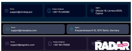 На двух сайтах указаны телефоны, email и адреса офисов на Кипре, а, в случае с Mesojetus, только email и адрес офиса в Берлине. Но проверка показывает, что оба адреса на Кипре – отели, и только берлинский – арендуемые несколькими компаниями опенспейсы и, даже не смотря на это, факт существование там офиса Mesojetus остаётся крайне сомнительным.