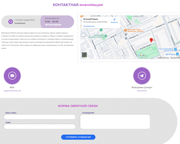 На сайте указаны email, Telegram-контакт, форма обратной связи и адрес офиса в Лондоне. Ни телефонов, ни социальных сетей.