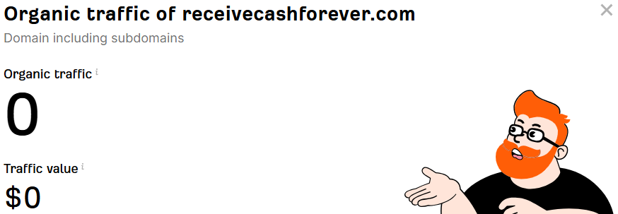 Проверка трафика показывает отсутствие органических посещений домена. Это настолько ленивый развод в исполнении ReceiveCashForever, что становится очевидно: никакой реальной торговли здесь не ведётся.