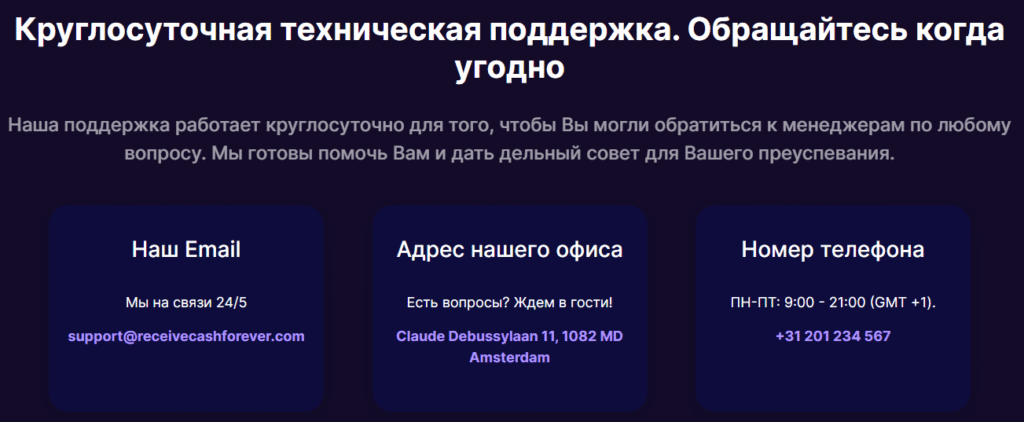 Но прежде, чем доверить ей свои деньги, ознакомимся с обзором наших экспертов. Изучив сайт брокера ReceiveCashForever, они обнаружили здесь явные признаки мошенничества.