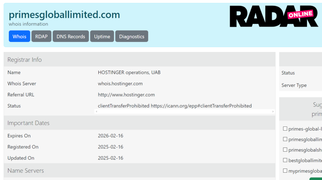 Брокер PrimesglobalLimited позиционирует себя как авторитетная инвестиционная платформа, предлагающая доступ к международным финансовым рынкам, таким как Форекс. Зайдя на сайт брокера primesgloballimited.com, вас встречает профессионально оформленная страница с обещаниями высокого дохода на Форекс, разными тарифами и бонусными программами. Звучит привлекательно, особенно для новичков, но это лишь верхушка айсберга. Как только мы начали копать глубже, выяснилось, что домен зарегистрирован совсем недавно. Этот факт сразу подрывает их заявления о многолетнем опыте и надежности. Такие мелочи, как регистрация домена, не кажутся важными на первый взгляд, но они говорят о многом — о том, как быстро мошенники запускают свои схемы.