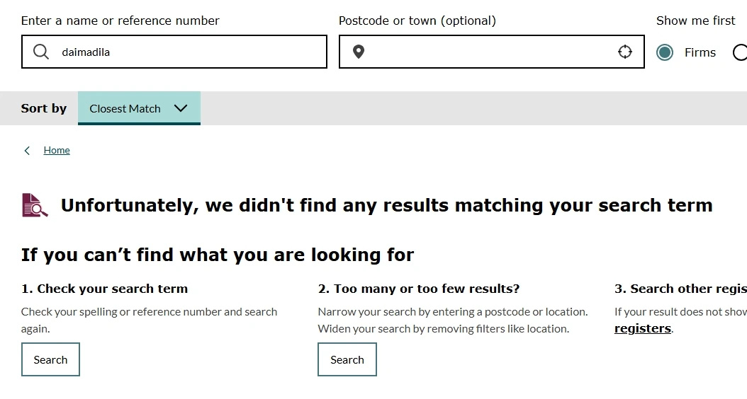 Проверка таких номеров в официальных реестрах не даёт результатов. Почему? Обратите внимание на адрес «реестра», куда вам отправляет сайт мошенников: https://fsa-regulation-uk.net/firm-754314