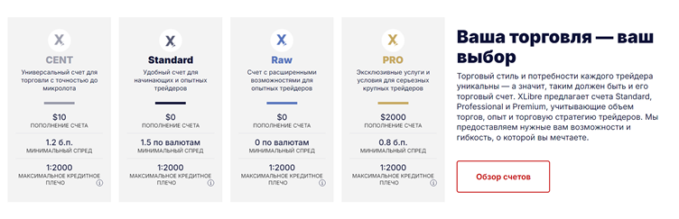 Брокер XLibre предлагает несколько типов аккаунтов, и это еще одна хитроумная ловушка. На сайте подробно описаны различные виды аккаунтов, каждый из которых якобы имеет уникальные преимущества для трейдеров разного уровня:
